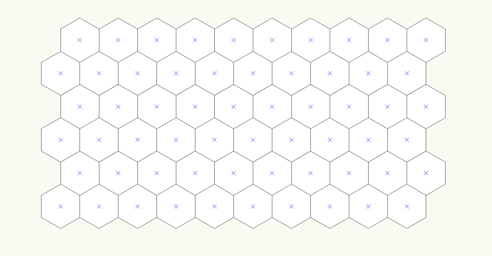 正六角形を敷き詰めた場合の、それぞれの正六角形の中心座標を求めます。奇数行目と偶数行目でx方向のオフセットが異なることに注意して座標値を計算します。