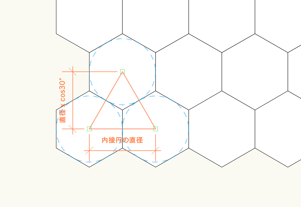 y方向のオフセットは、内接円の直径にcos30°を掛けた値となります。
