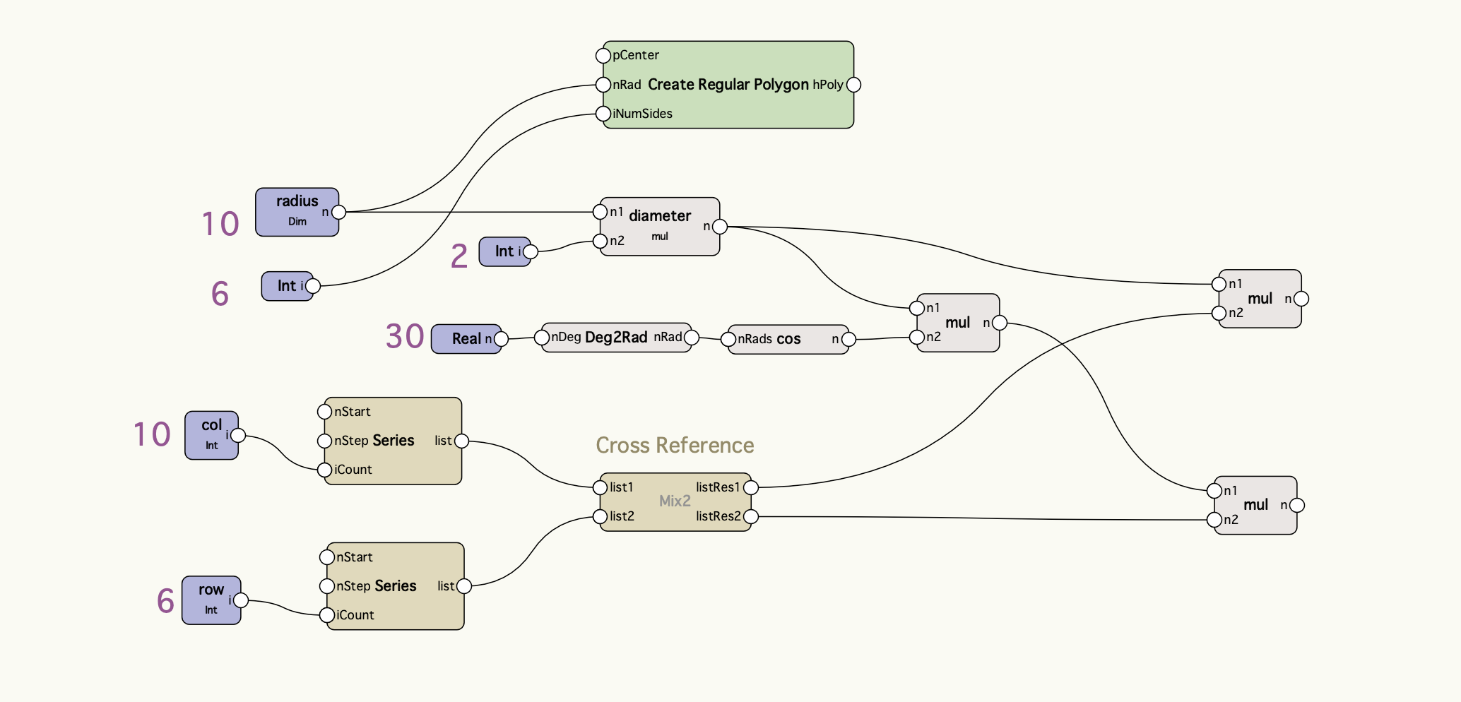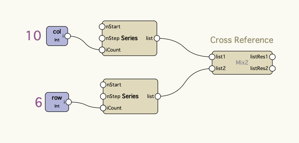 行数と列数を指定して中心座標のグリッドを作成していきます。行数と列数の数列をCrossReferenceで組み合わせて、2次元の配列を作成します。