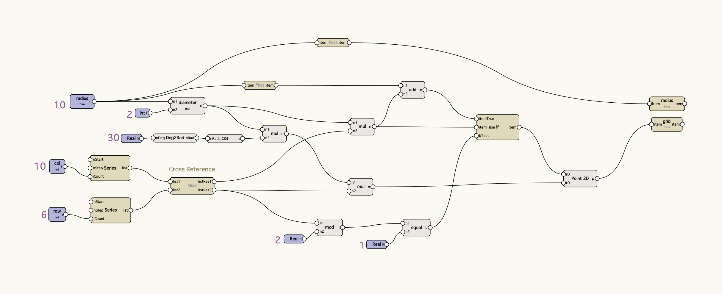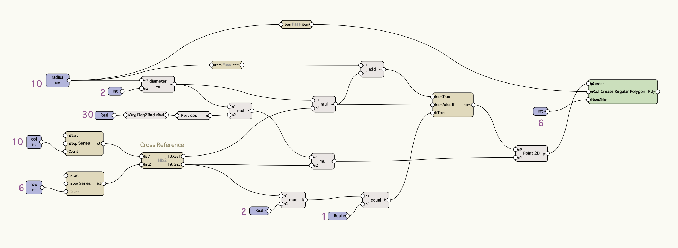 この配列にx方向とy方向のオフセットを掛け合わせて、正六角形の中心座標を求めます。このとき、奇数行のみx方向に半径の大きさだけ加算するように、ifノードを使用してオフセットの値を切り替えます。