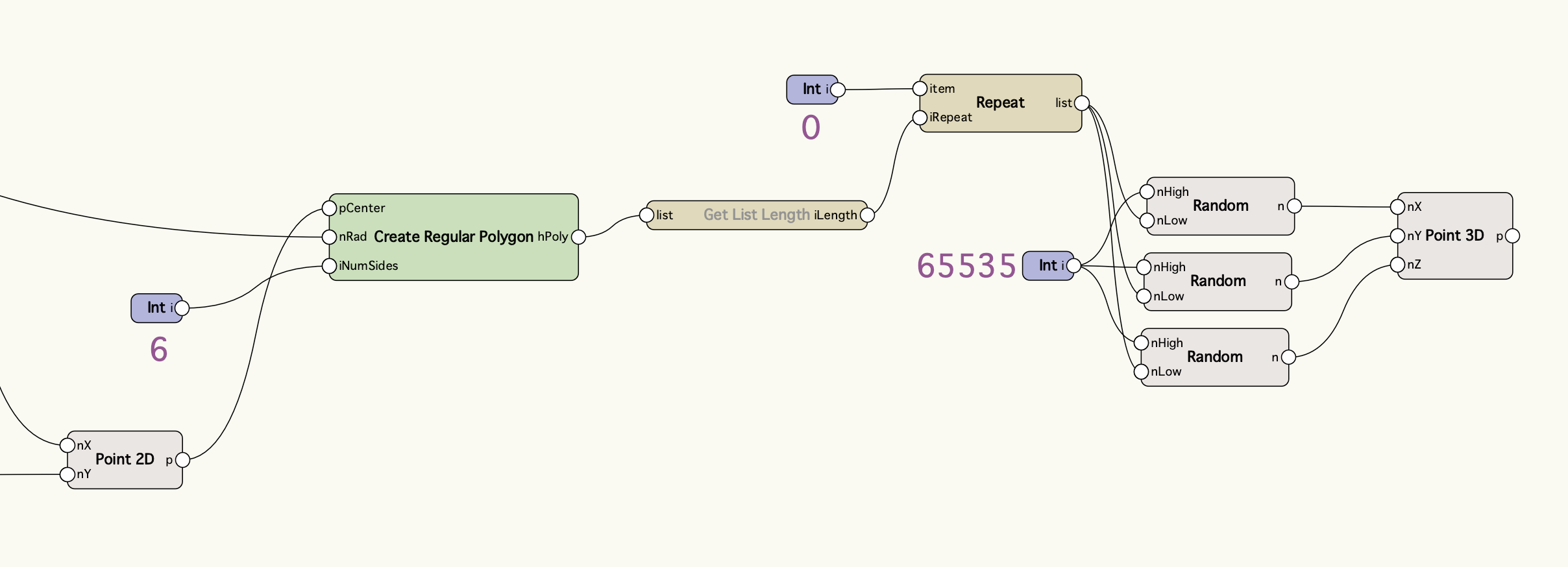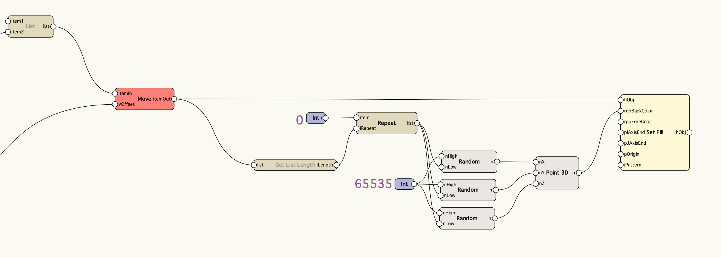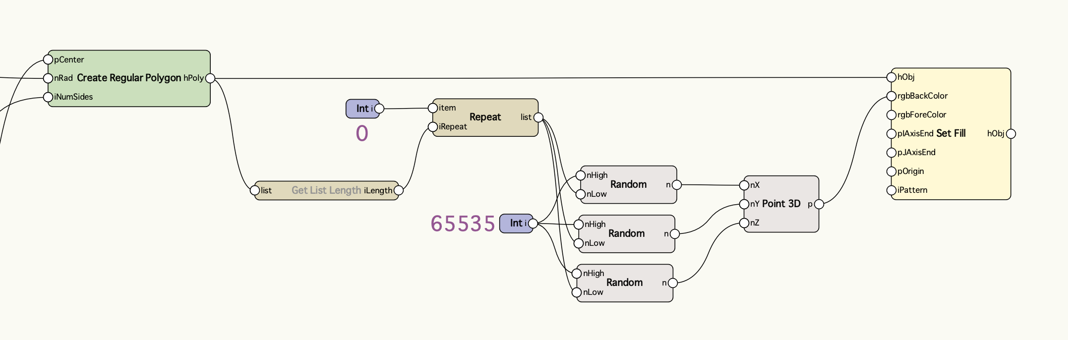 RGB値はRGBそれぞれの値を0〜65535の間で設定します。Point3Dノードを使用してタプル型のデータに整形します。このとき、図形の数だけランダム値を発生させる必要があるためRepeatノードで入力を増やす必要があります。