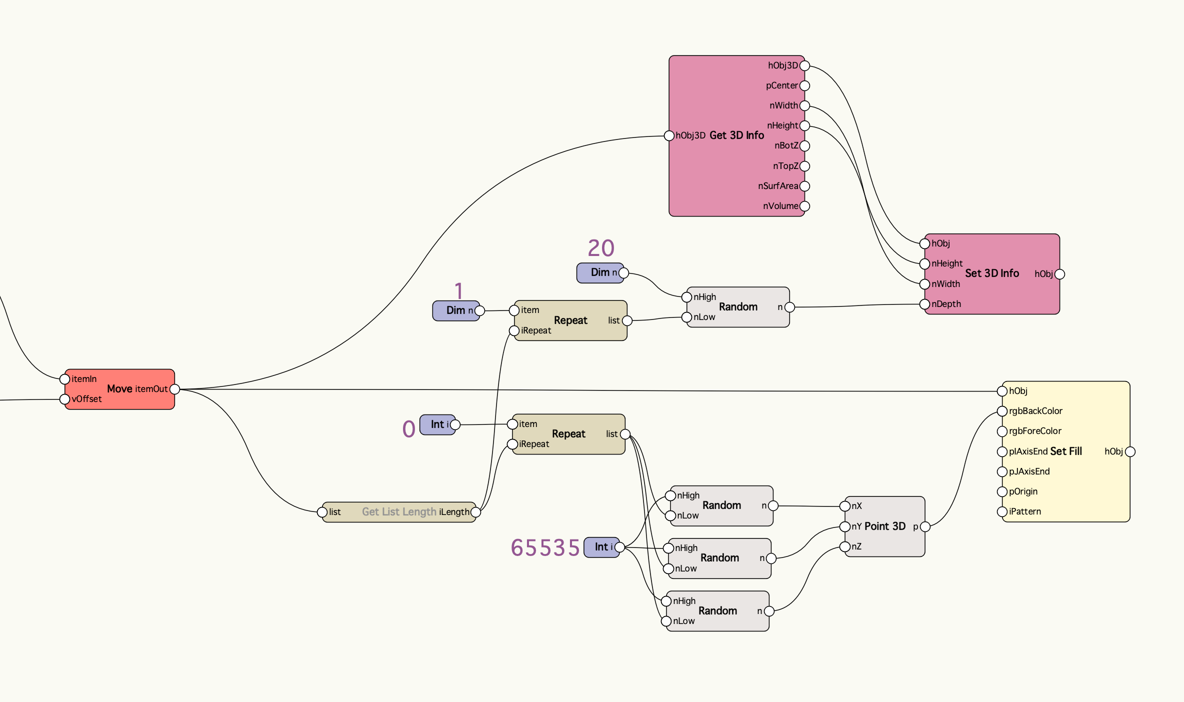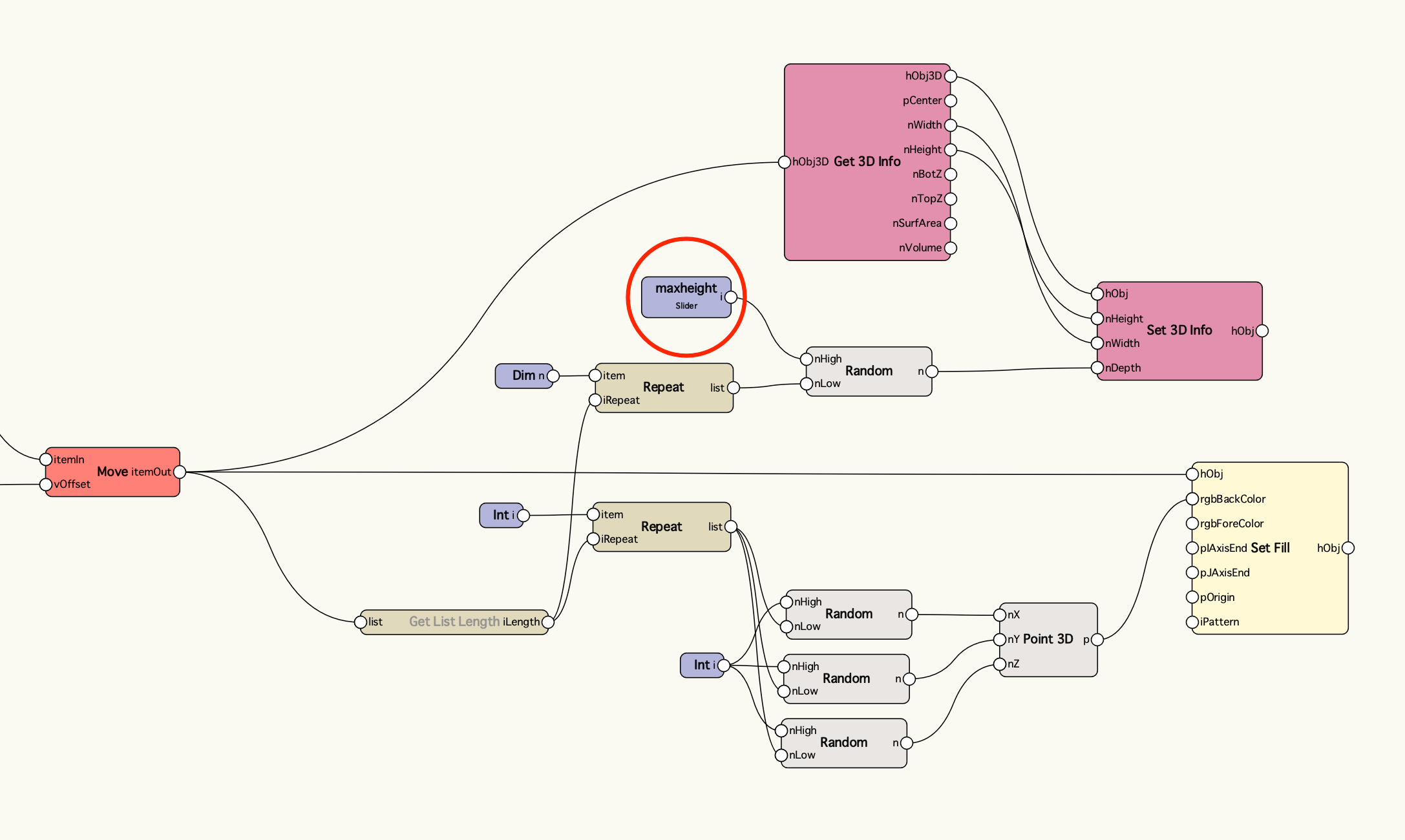 ついでに、カラーリングだけでなく押し出しの高さもランダムに設定します。高さ用のランダム値を生成した後、Get 3D InfoとSet 3D Infoノードを使用して高さの値に入力します。