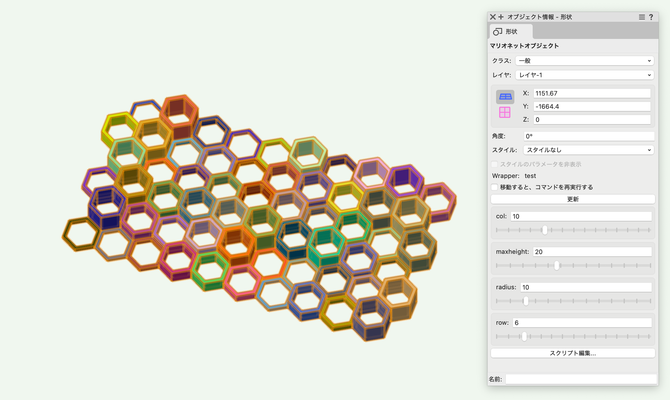 正六角形の半径、行数と列数、押し出しの高さの上限値をスライダーに変更して、マリオネットオブジェクトに変換します。