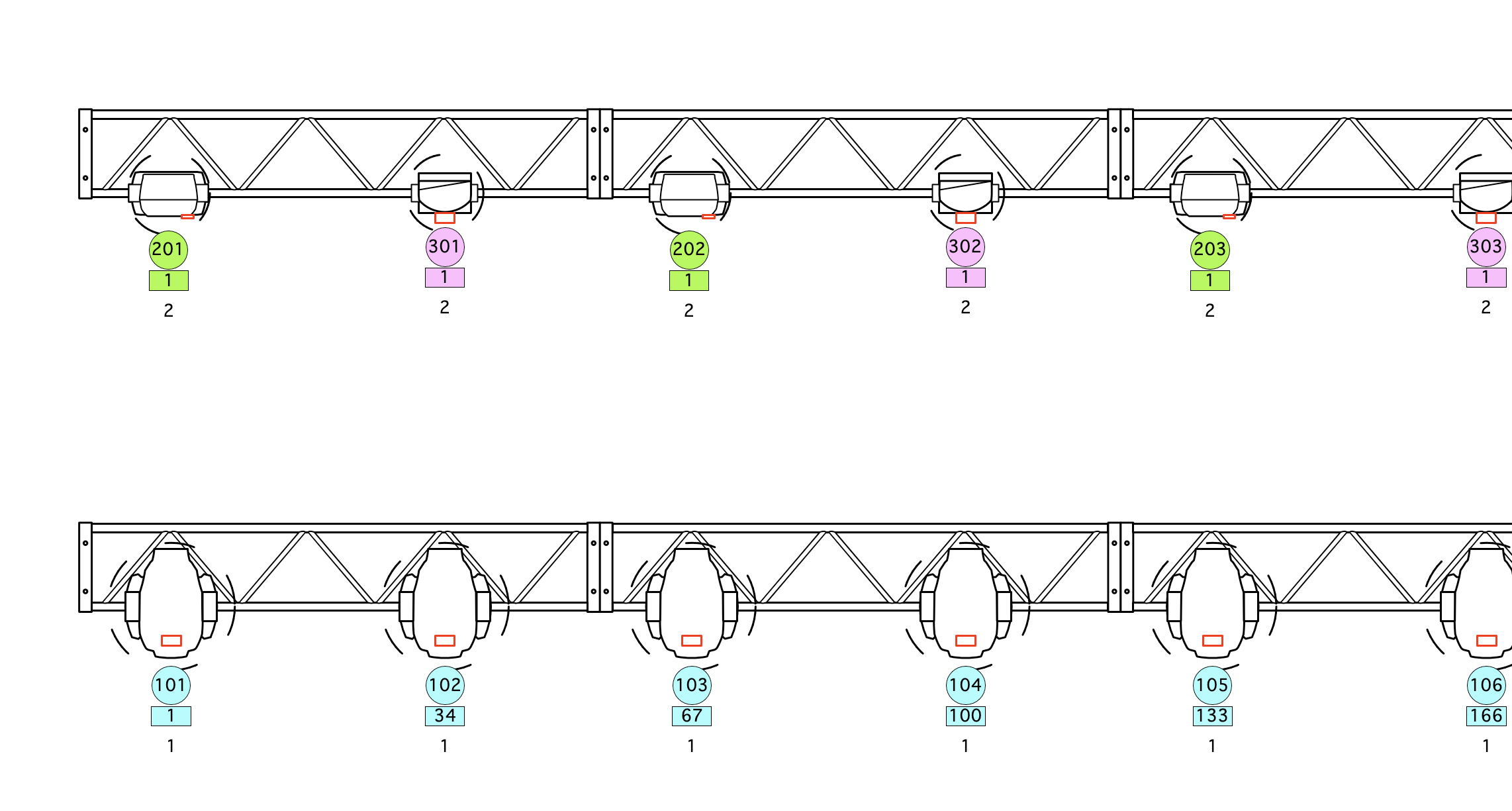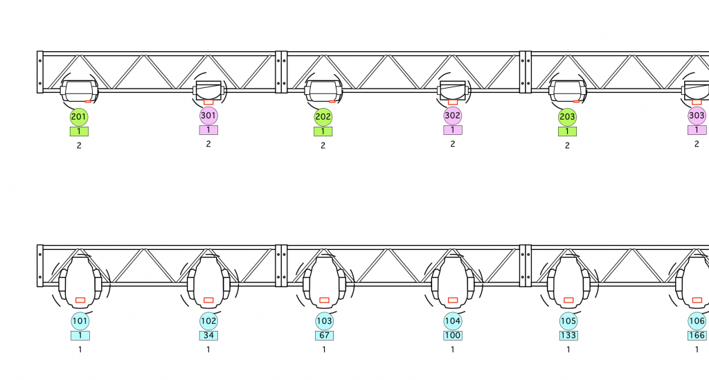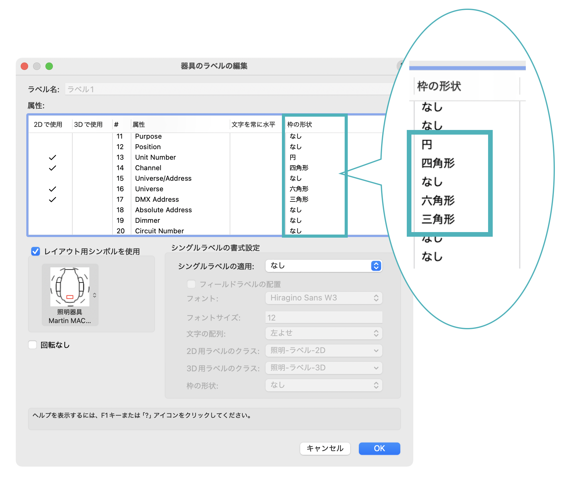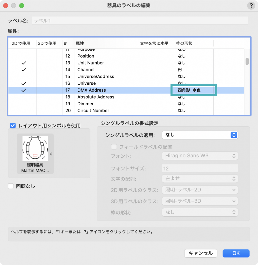 器具ラベル内のChannelやDMX Addressなどの値を囲む枠は、図面上ですぐに把握できるよう会社ごとに独自の形状を使う場合も少なくありません。