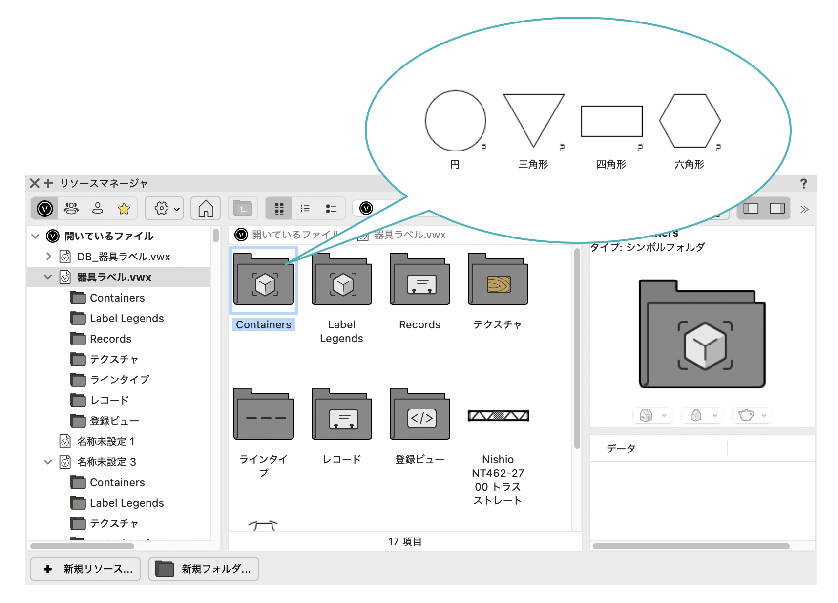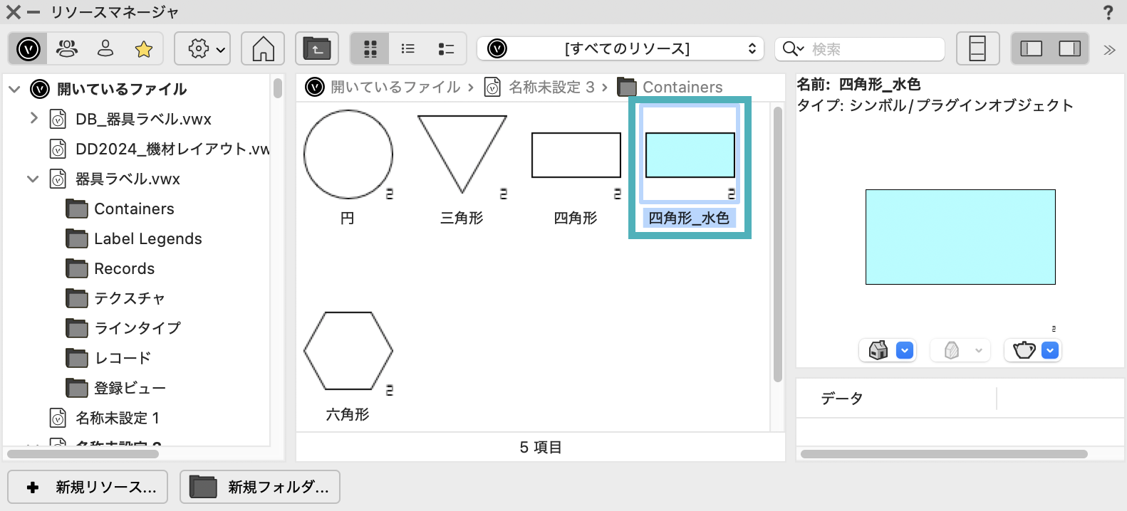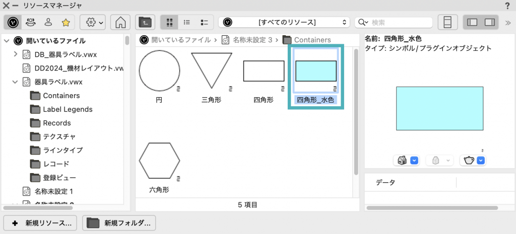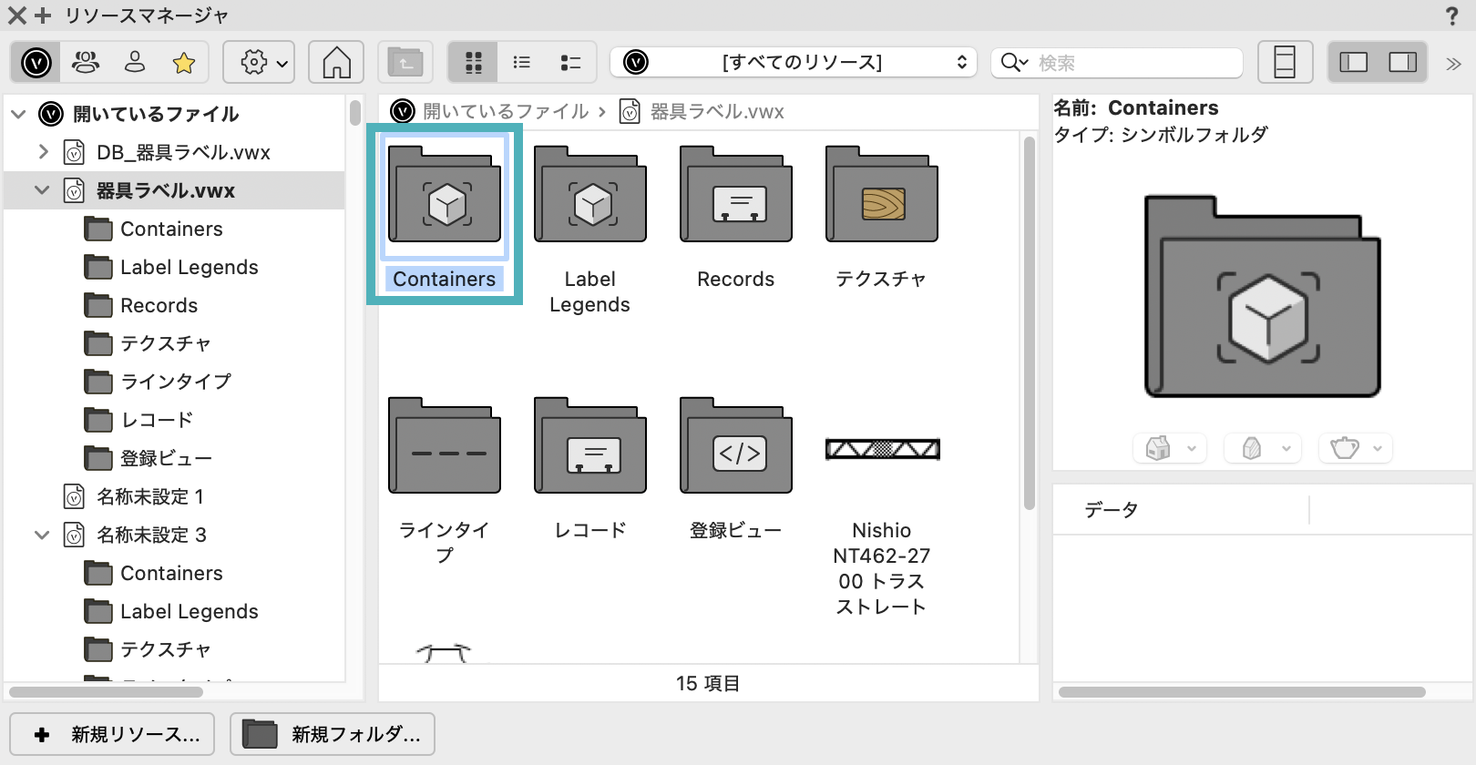 5. リソースマネージャの「Containersフォルダ」内に作成したシンボルが追加されます。