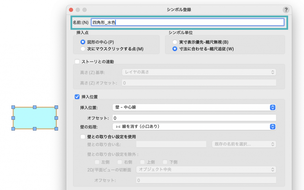3. 使用したい枠の形状を作図してシンボルとして登録します。その際、シンボルの名称を器具ラベルの編集ダイアログの枠の形状で表示させたい名称に設定します。