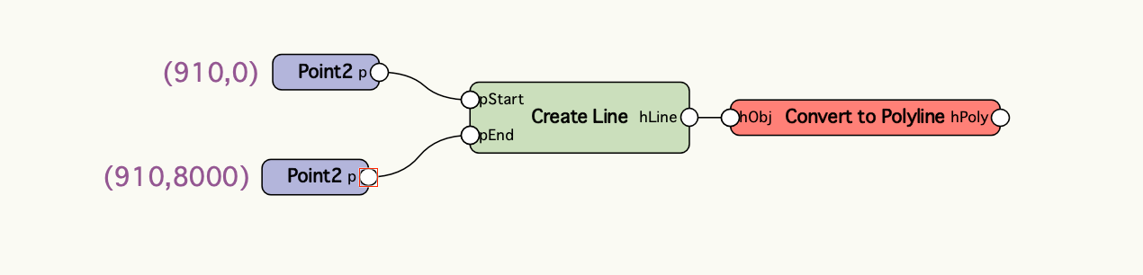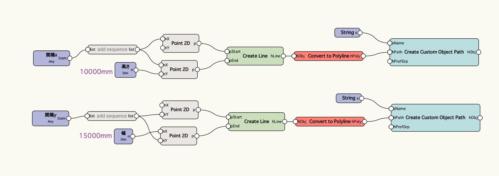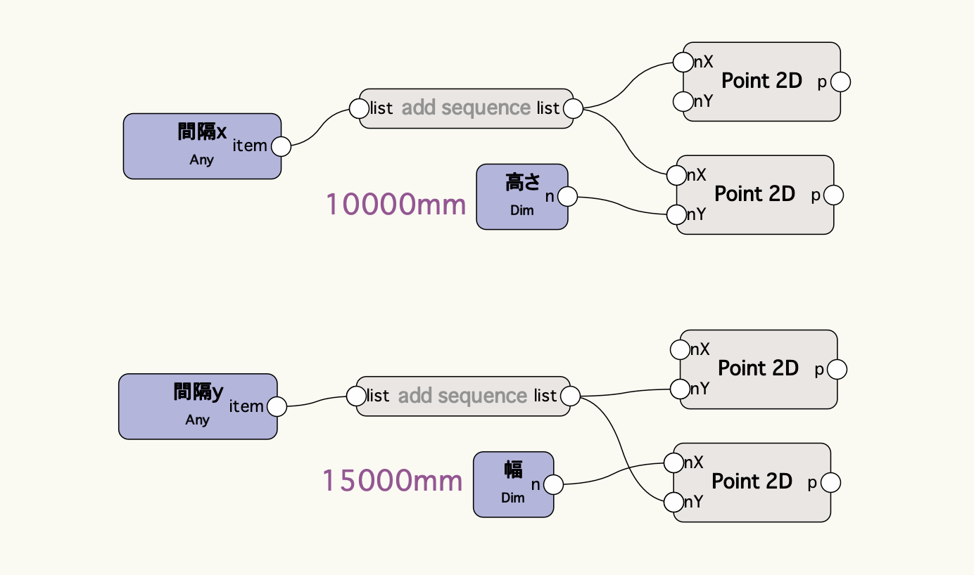 y方向についても同様に間隔のリストからy座標のリストを作成して、始点のx座標を0、終点のx座標を10000mmに設定します。