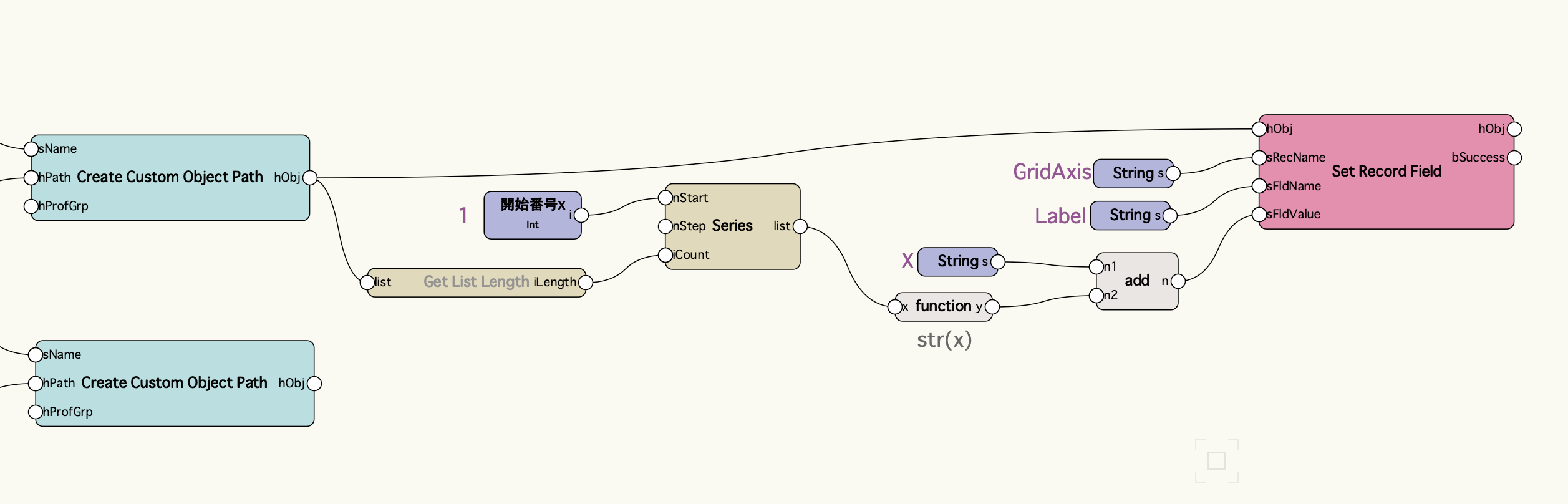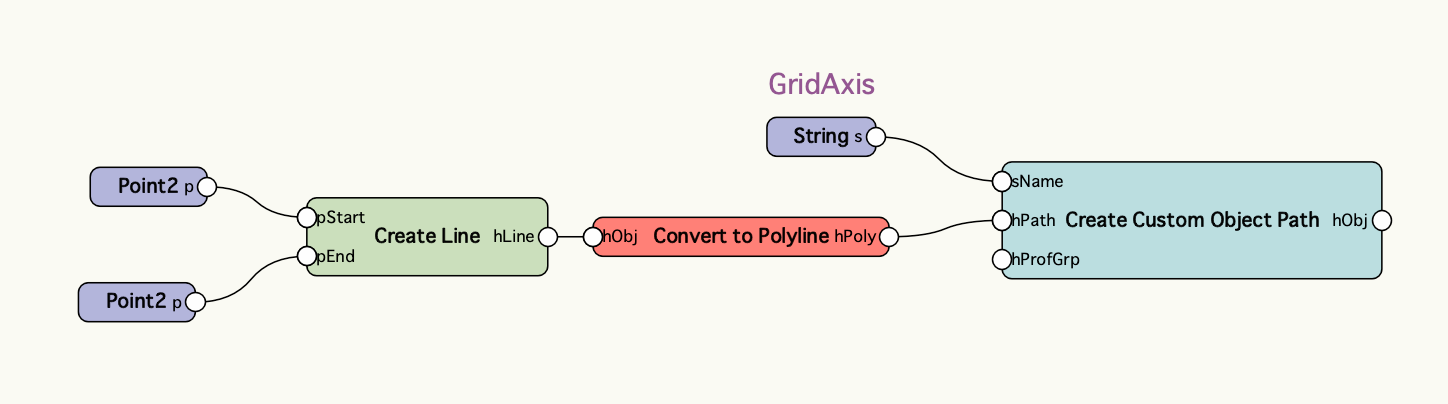プラグインオブジェクトを作成できるCreate Custom Object Pathノードを使用します。グリッド線のオブジェクト名である「GridAxis」を指定してオブジェクトを生成します。