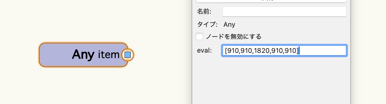 add sequenceノードはリストの各要素までの値を加算したリストを生成できる便利なノードです。このノードを使用してx座標のリストを作成します。