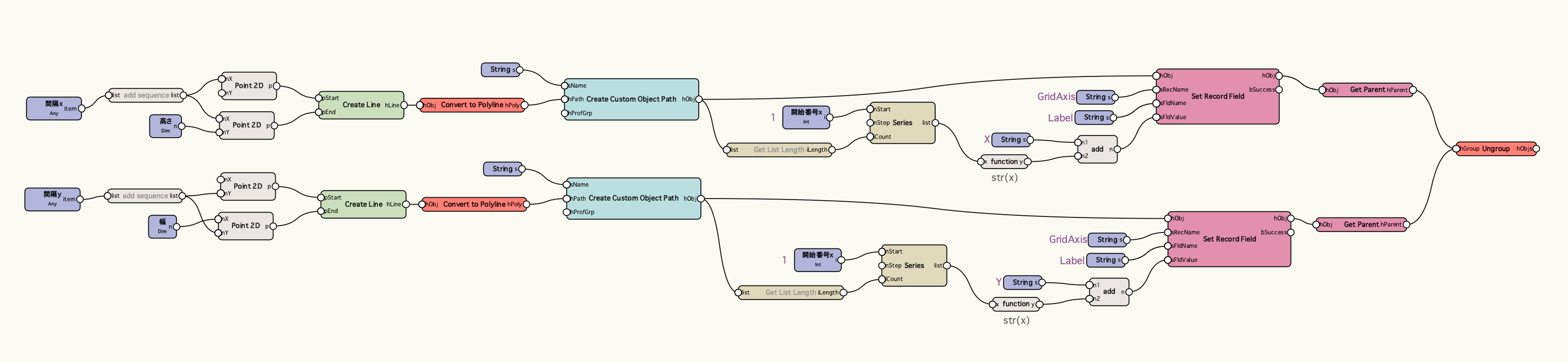 通り芯を作図するためのツールとして便利なグリッド線ツールですが、より効率よく作業を進めるために間隔を指定するだけでグリッド線オブジェクトがまとめて配置されるプログラムを作って行きます。