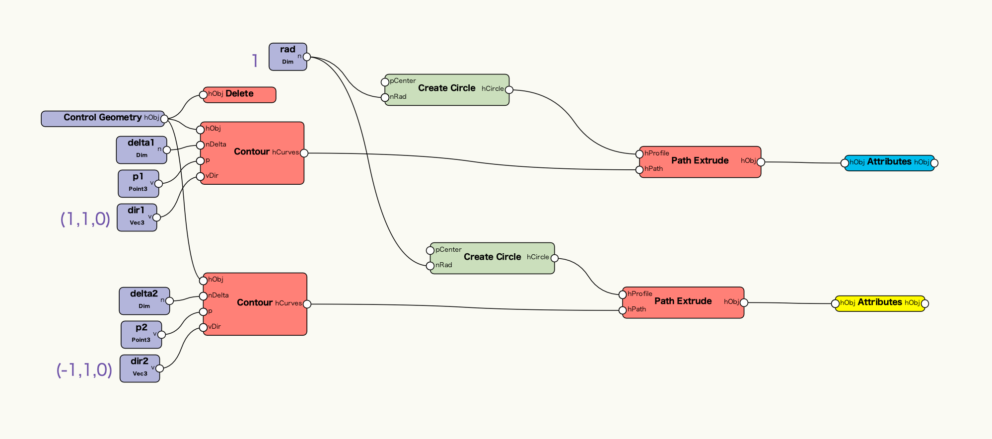 輪切りにしたNURBS曲線をPath Extrudeノードに入力してパス押し出しに変換します。ここでは円を断面として入力します。