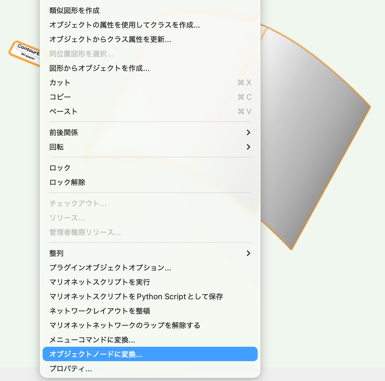 ラッパーノードと元図形を選択した状態でオブジェクトノードに変換を選択すると、元図形がコントロールジオメトリに登録されます。