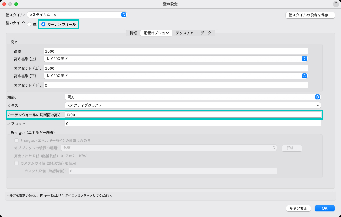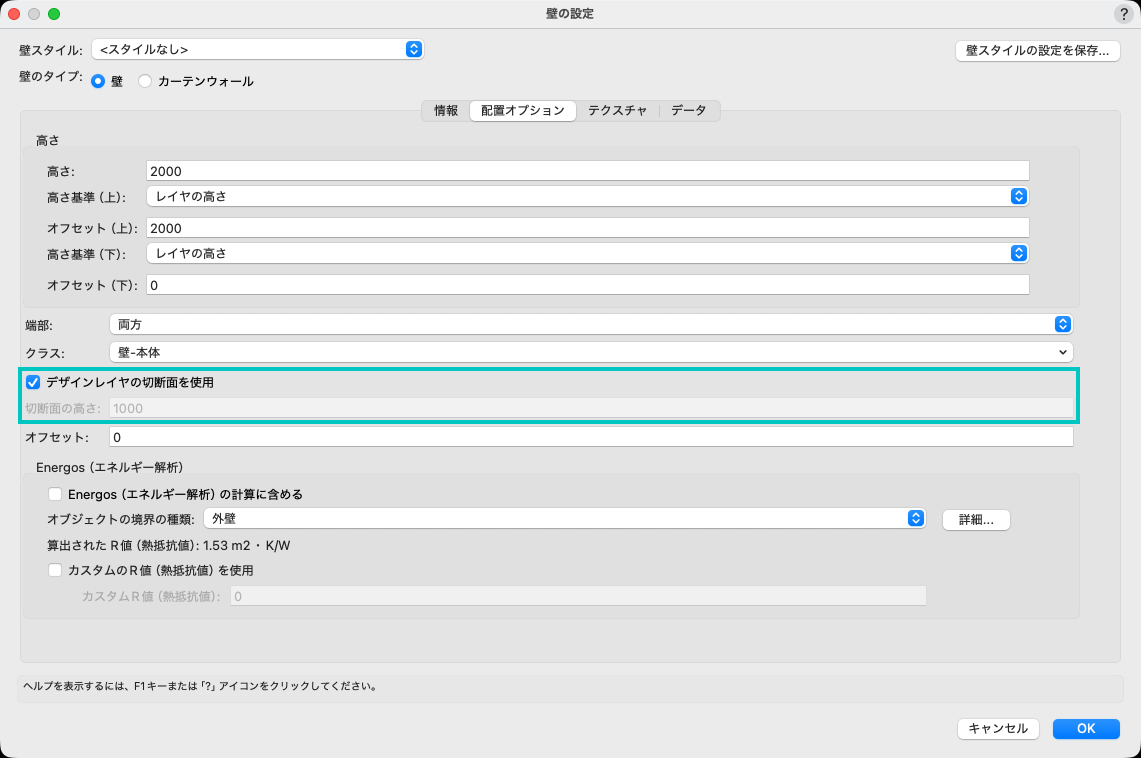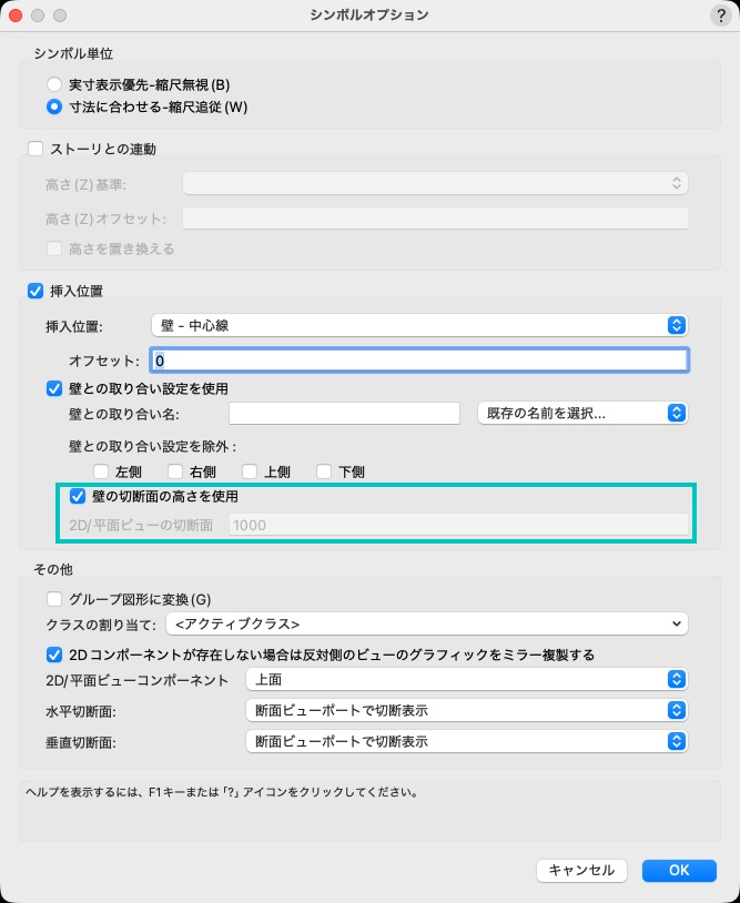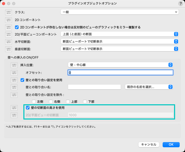プラグインオブジェクトと同様、壁の切断面の高さを使用と2D/平面ビューの切断面の2つのパラメータがあります。
