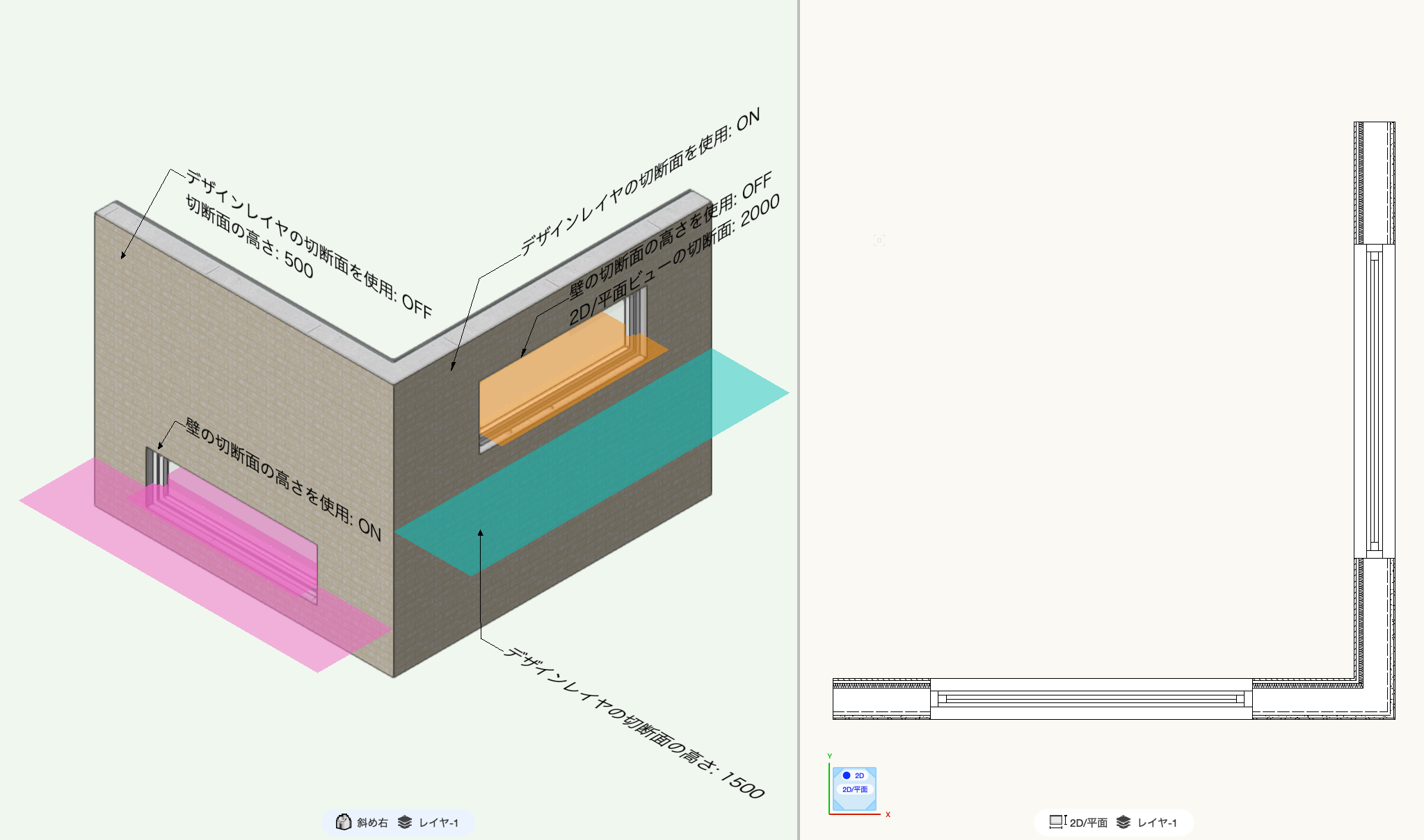 右の壁はデザインレイヤの切断面の高さを使用していますが、窓は個別に切断面の高さを定義しています。