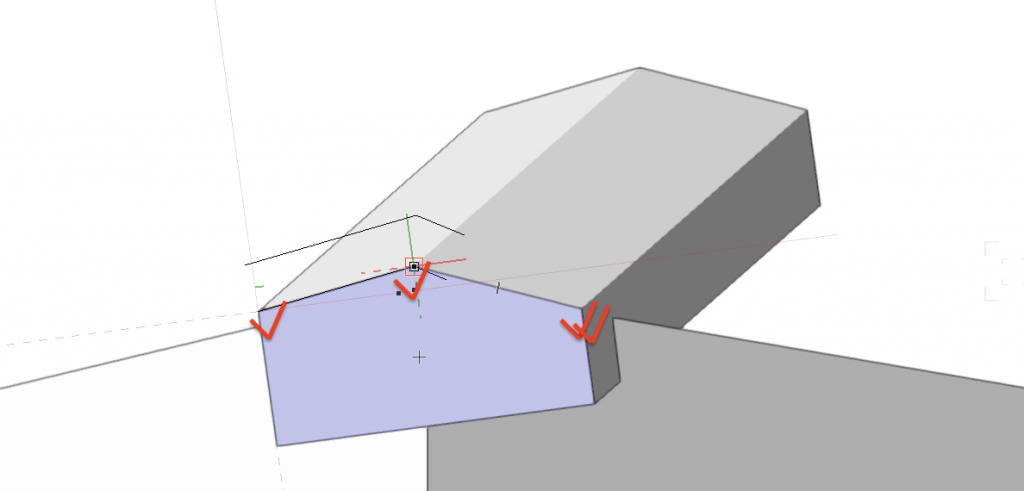 7. プッシュ/プルツールの移動モードで、3. で作成した図形を覆うように伸ばします。同様に、逆側の屋根も伸ばしてください。