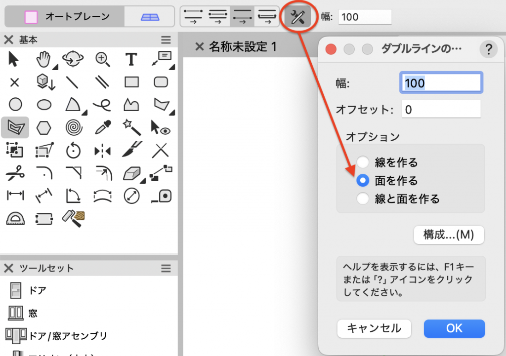 12. ダブルライン多角形ツールを選択し、ツールバーのオートプレーンをONに、右側指定モードを選択して、幅にカバーの厚みを入力します。設定ボタンをクリックし、面を作るにチェックを入れてOKします。