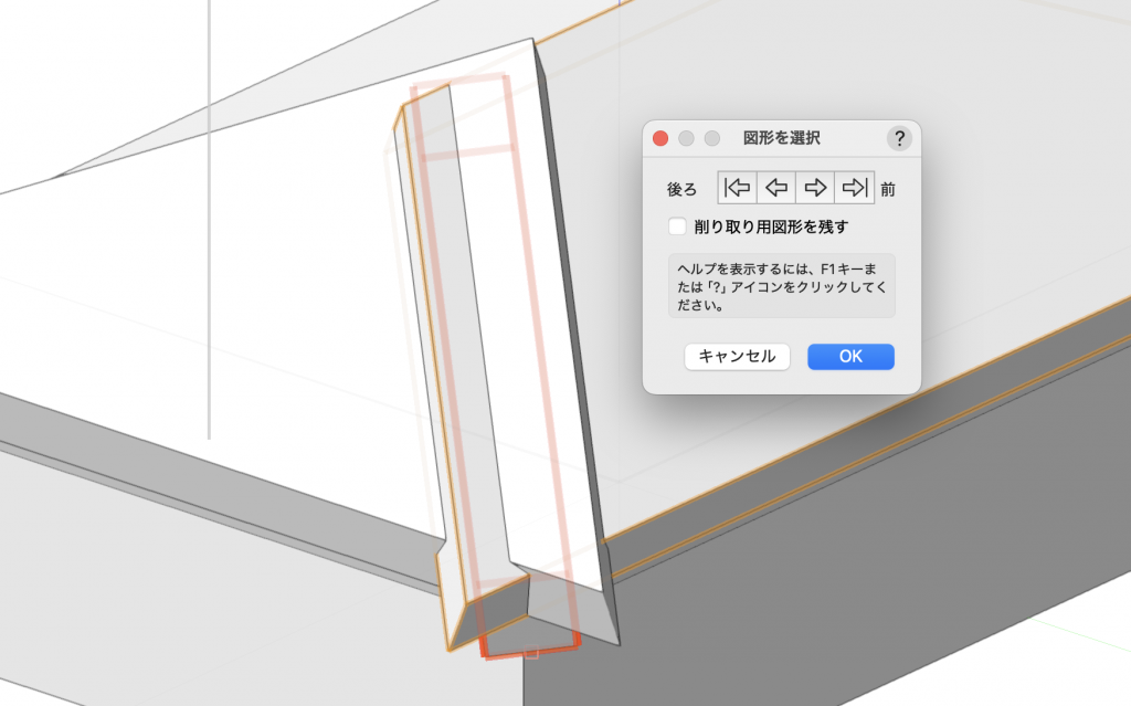 9. 屋根上の図形を1つと、3. で作成した図形を選択し、モデル>削り取るで、3. で作成した図形が赤くハイライト表示される状態でOKします。
