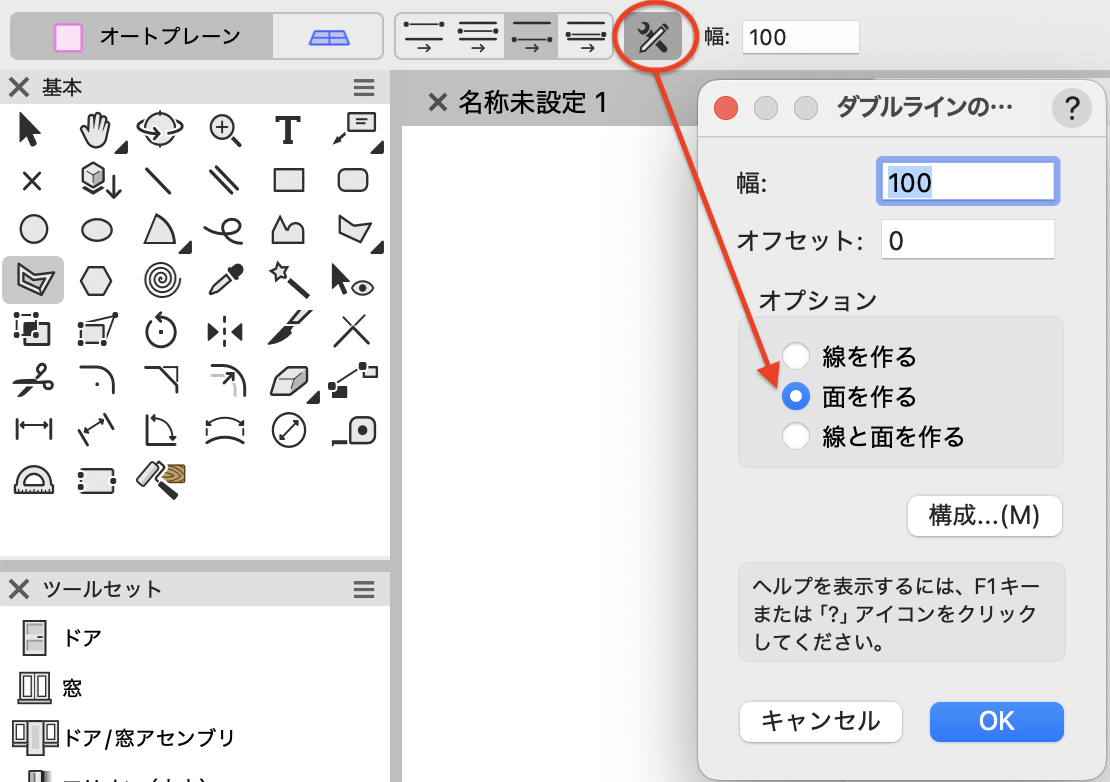 12. ダブルライン多角形ツールを選択し、ツールバーのオートプレーンをONに、右側指定モードを選択して、幅にカバーの厚みを入力します。設定ボタンをクリックし、面を作るにチェックを入れてOKします。