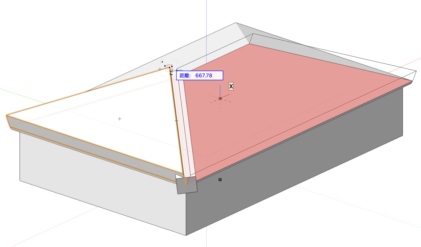 7. プッシュ/プルツールの移動モードで、3. で作成した図形を覆うように伸ばします。同様に、逆側の屋根も伸ばしてください。