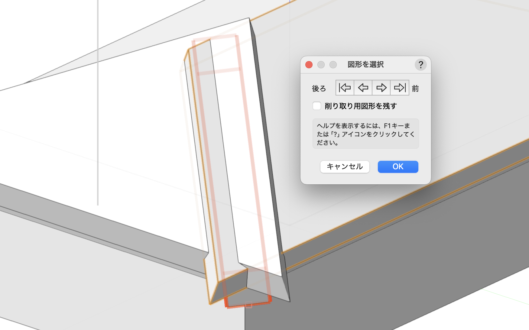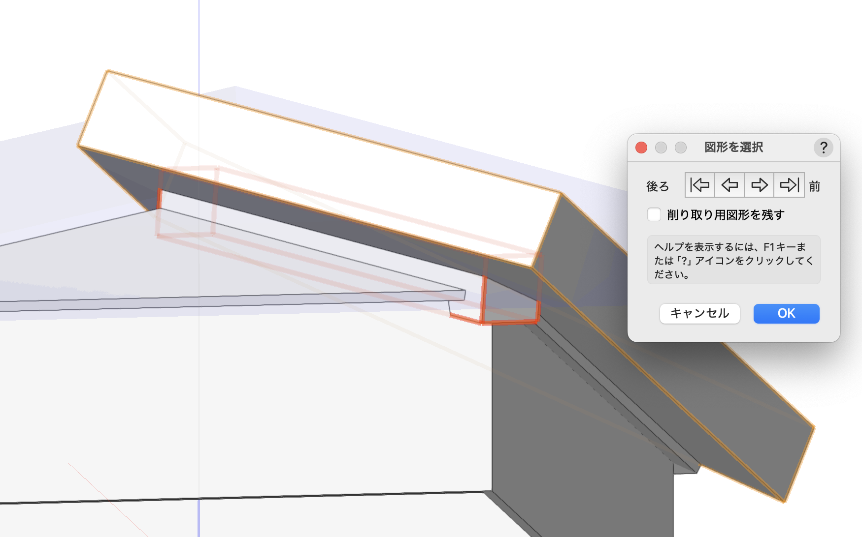 9. 屋根上の図形を1つと、3. で作成した図形を選択し、モデル>削り取るで、3. で作成した図形が赤くハイライト表示される状態でOKします。