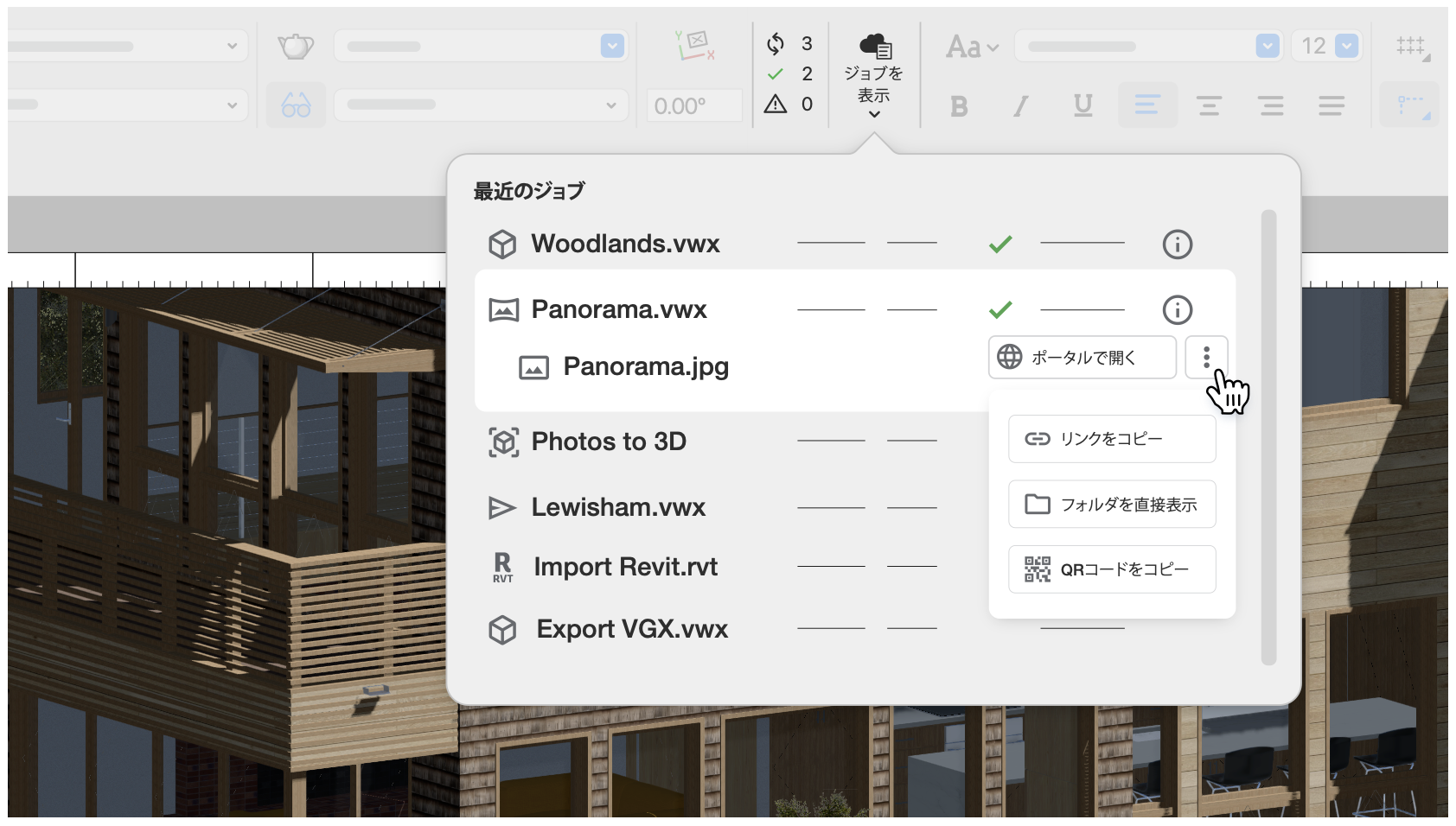 投稿日: 2026年4月7日第15回「クラウドステータスで処理状況を確認」 Vectorworks 2026では、表示バーにクラウドステータスが追加され、リアルタイムでクラウドの処理状況の確認や、結果ファイルへのアクセス、共有ができるようになりました。 今回は、クラウドステータスでできることを紹介します。 “第15回「クラウドステータスで処理状況を確認」” の続きを読む